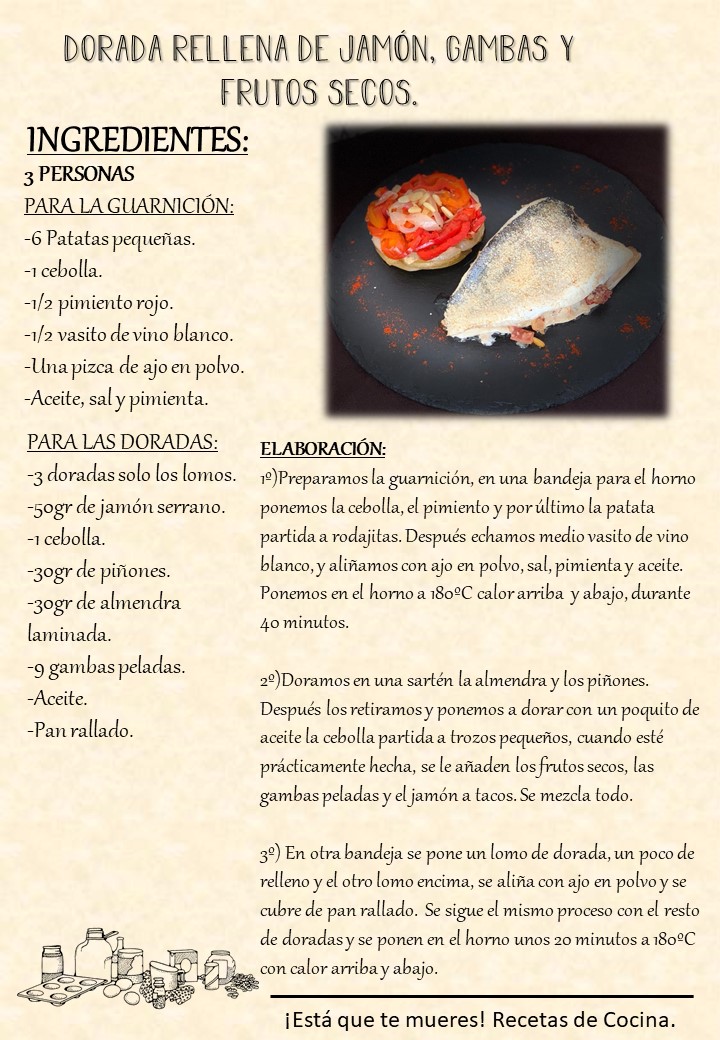 Os animo a que la probéis, la dorada es un pescado blanco poco graso y el relleno que lleva es bastante ligero, así que si estáis cuidando vuestra dieta os recomiendo este plato.