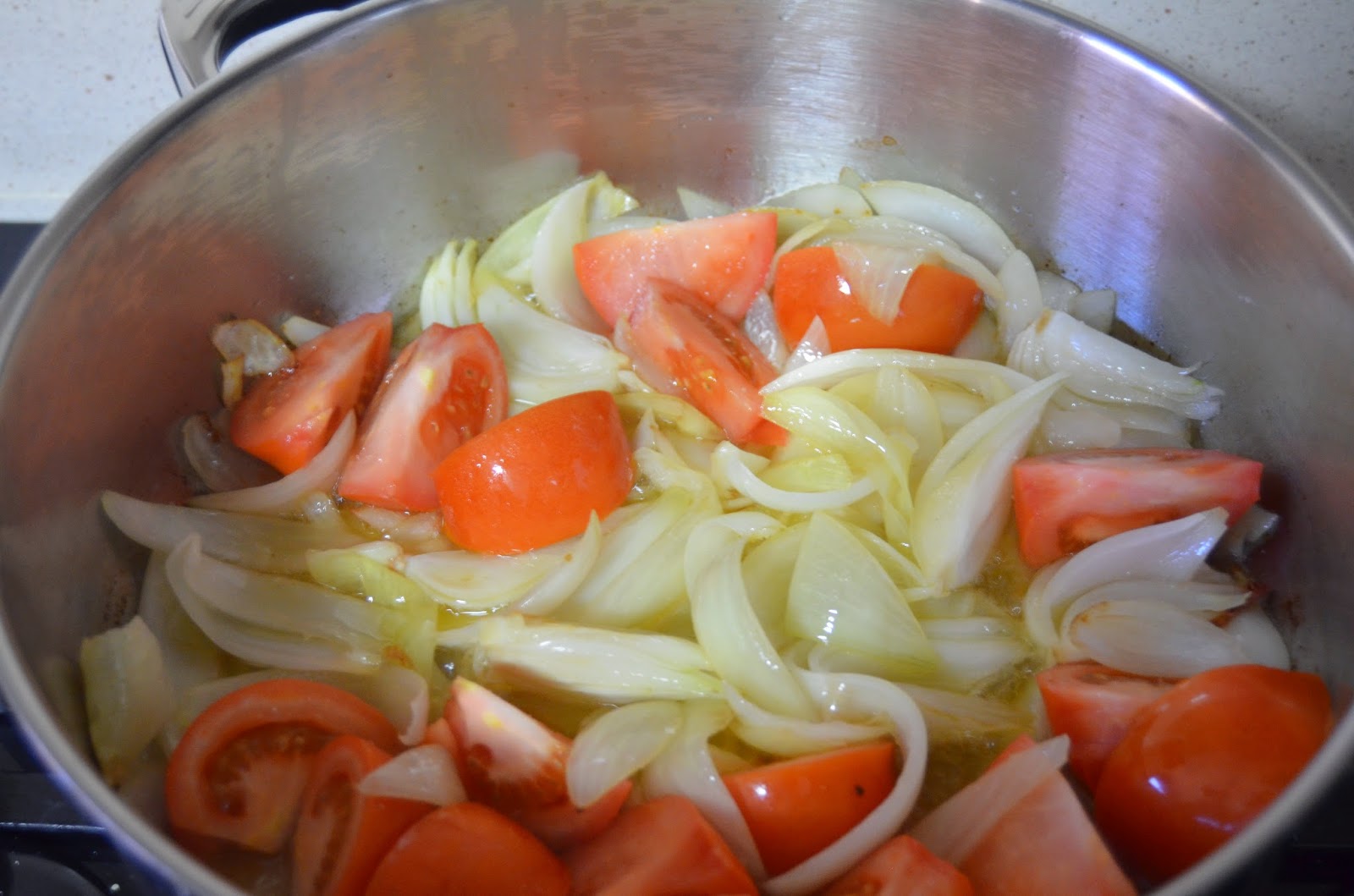 En una olla ponemos ese aceite colado y freímos las cebollas y el tomate partido a gajos, con cuidado retiramos la piel del tomate.
